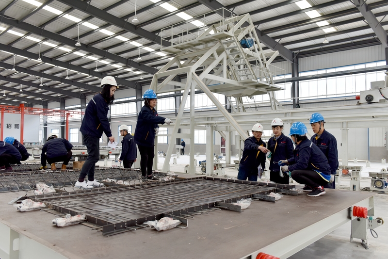 在環(huán)保裝配式PC構(gòu)建生產(chǎn)線,工人正忙著對模具進行驗收。王炳杰介紹,這套設(shè)備5000多萬,用的就是經(jīng)過處理的建筑垃圾,全自動流水線作業(yè),4月中下旬開始試運營。他說:“我們這條生產(chǎn)線自動化程度高,能生產(chǎn)裝配建筑用的疊合板、樓梯、陽臺、空調(diào)板等,蓋房子就和拼積木一樣。”