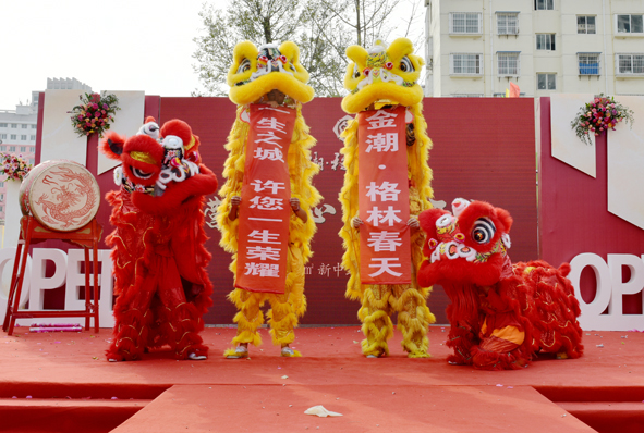 總經理彭殿坤鏗鏘有力的致辭之后后,鑼鼓聲啟,象征東方祥瑞的舞獅威風登場,四只瑞獅的嫻熟配合和精湛表演,讓現(xiàn)場瞬間熱烈沸騰。隨后,總經理彭殿坤邀請其他三位領導共同上臺進行“醒獅點睛”,一點左眼——生意興隆,二點右眼——財源廣進,三點天靈——前程似錦!金潮·格林春天營銷中心正式開門納客!