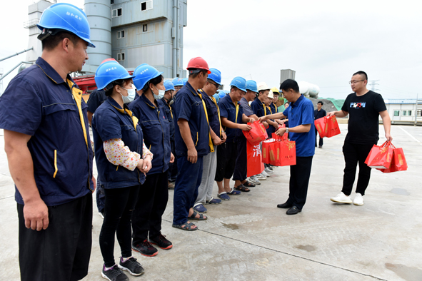 8月6日下午,招遠(yuǎn)市總工會(huì)黨組書記、常務(wù)副主席王利亭等一行4人到山東金潮股份公司旗下子公司——山東招和環(huán)保建材有限責(zé)任公司戶外工作現(xiàn)場(chǎng),為堅(jiān)守在烈日和高溫下的一線職工發(fā)放內(nèi)裝茶葉、礦泉水的 “消暑禮包”,并致以親切的慰問。
